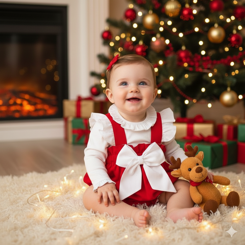 Fofo com alças em bombazine vermelho com folhos e laço em branco.