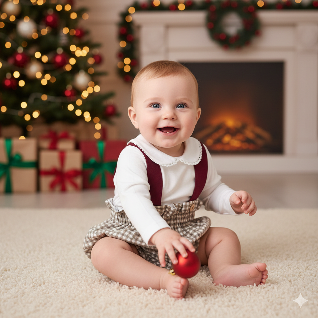 Fofo em vaiela xadrez beje e creme com alças em bordeaux.