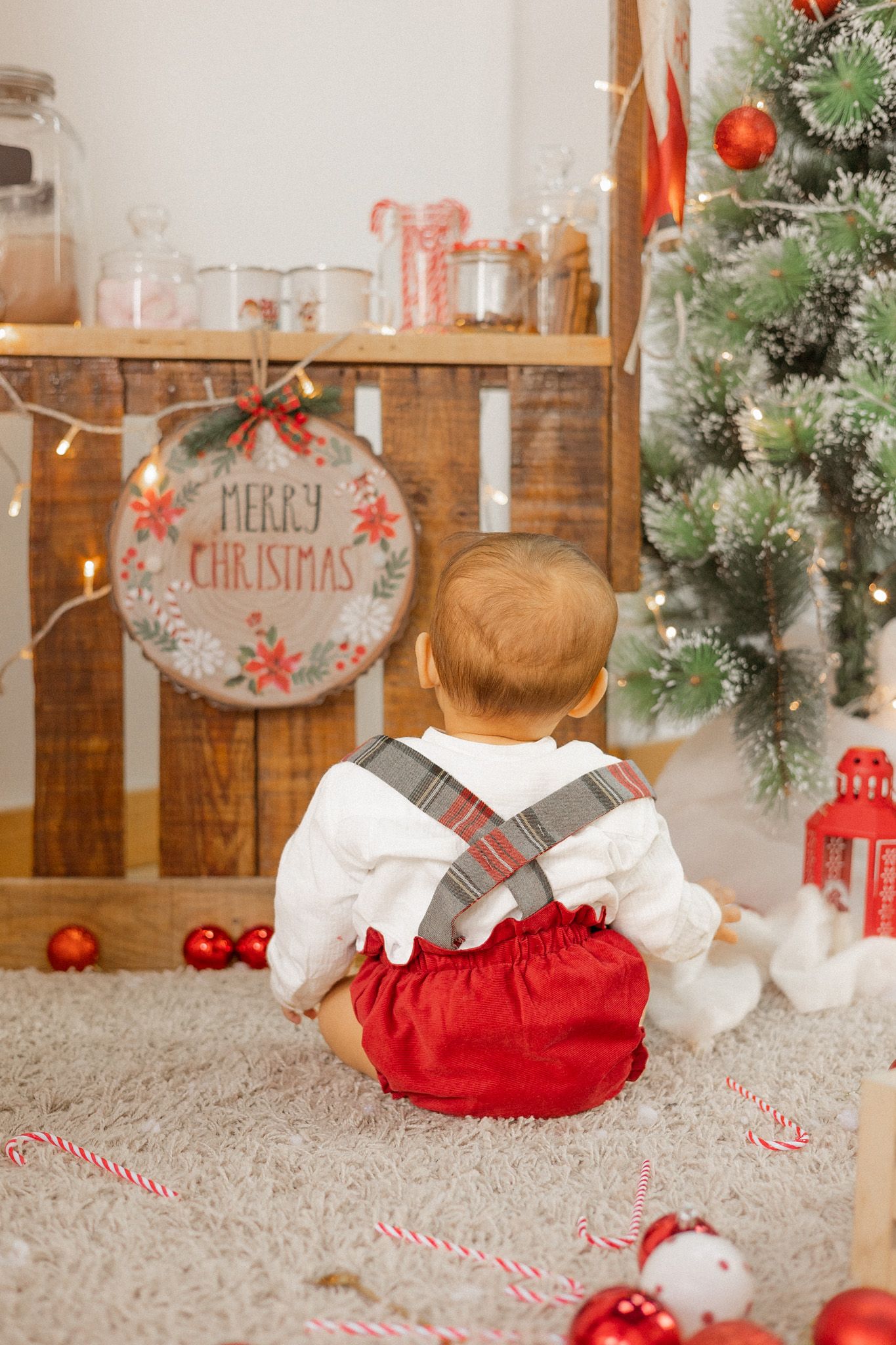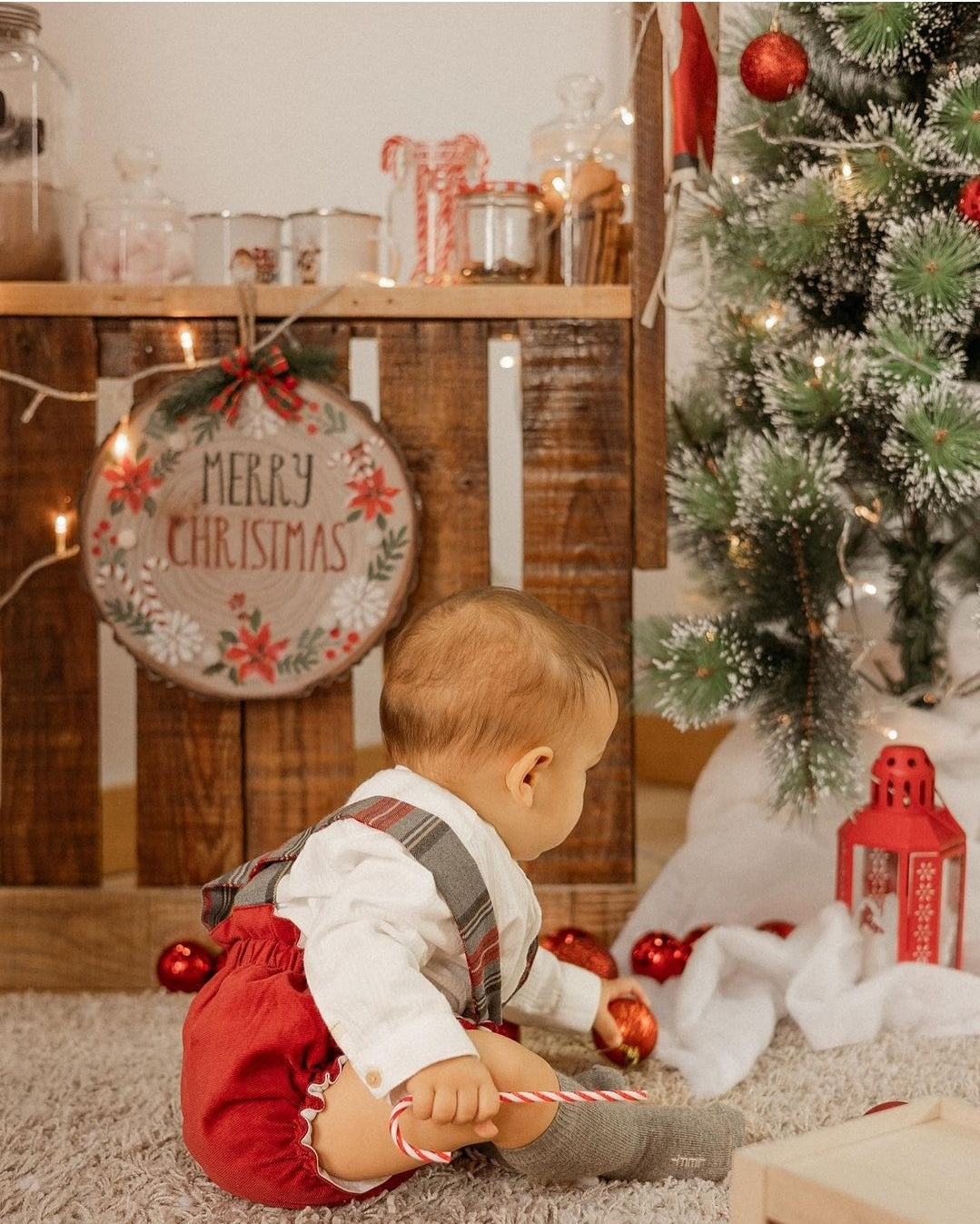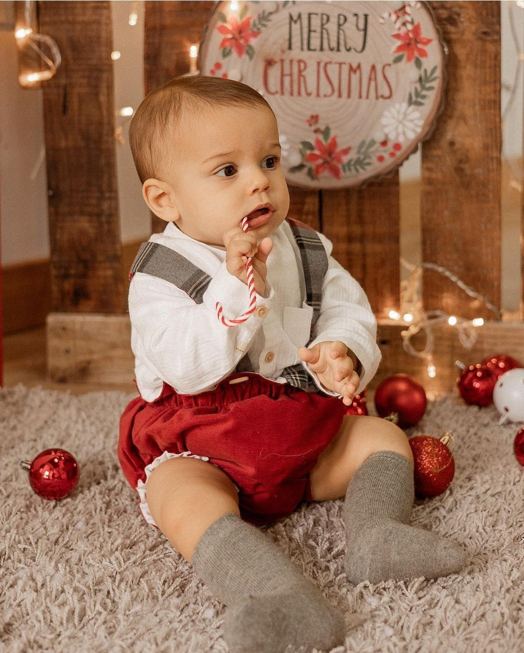 Fofo em bombazine vermelha com alças em tartan xadrez cinza e vermelho.