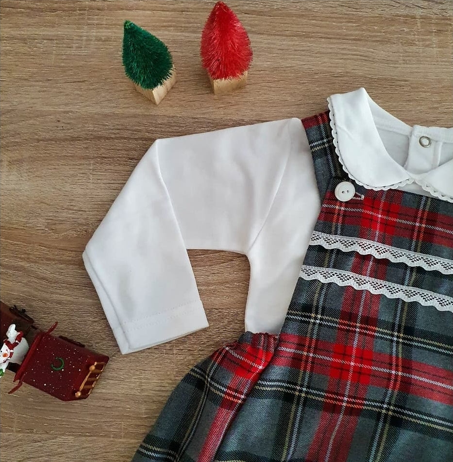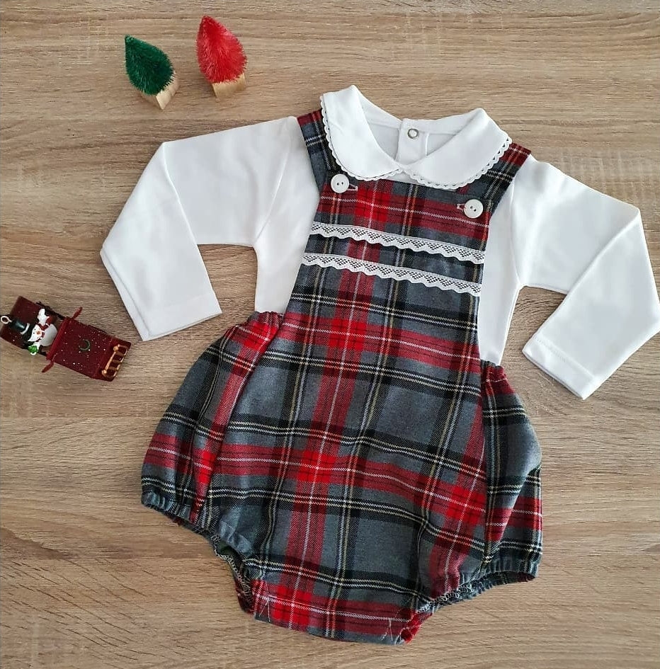 Fofo com peito em tartan cinza e vermelho com rendinha no peito.