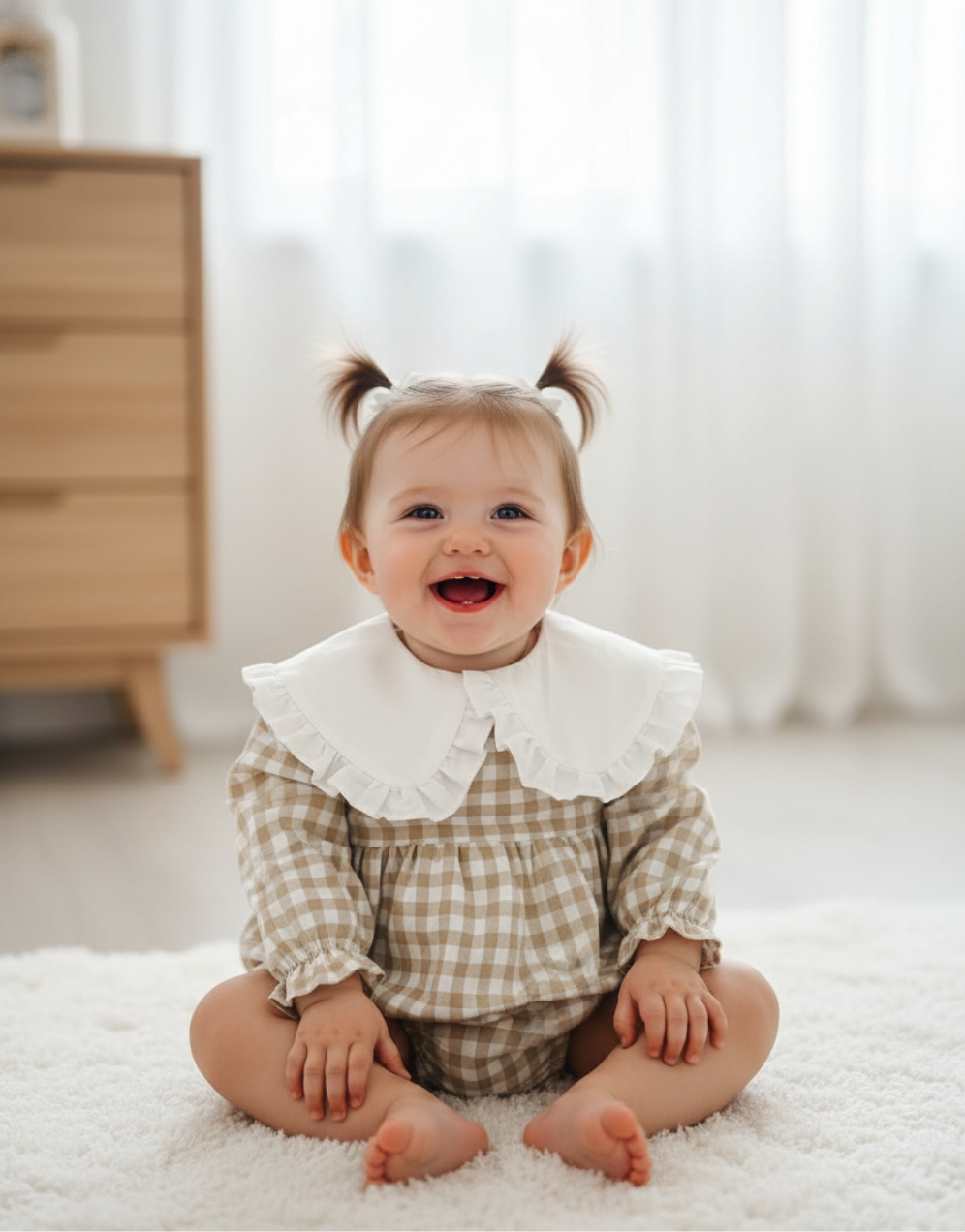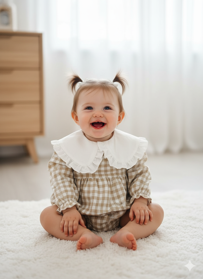 Fofo em vaiela creme com quadradinhos beje com gola branca. Quadrados com 9mm
