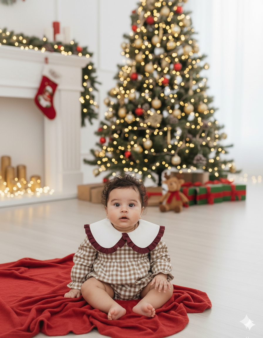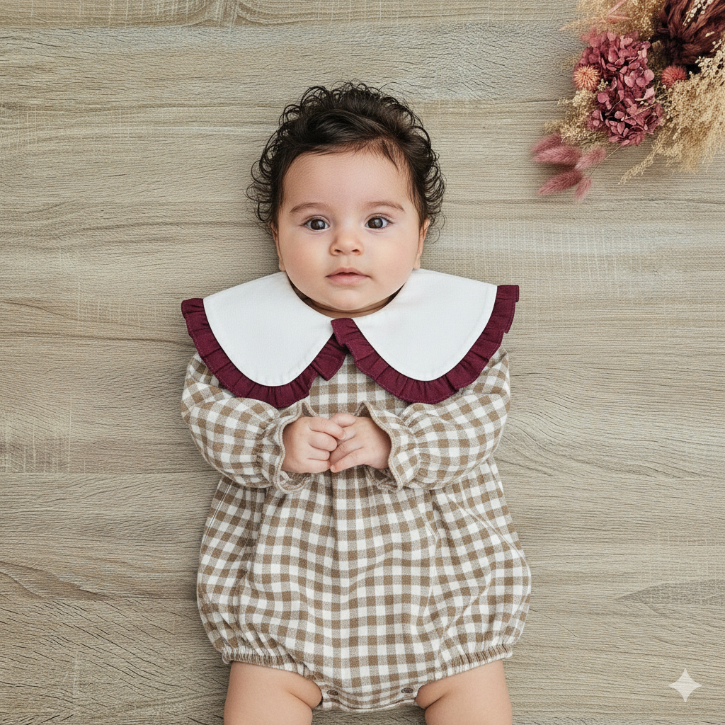 Fofo em vaiela creme com quadradinhos beje com gola branca e folho em bordeaux. Quadrados com 9mm