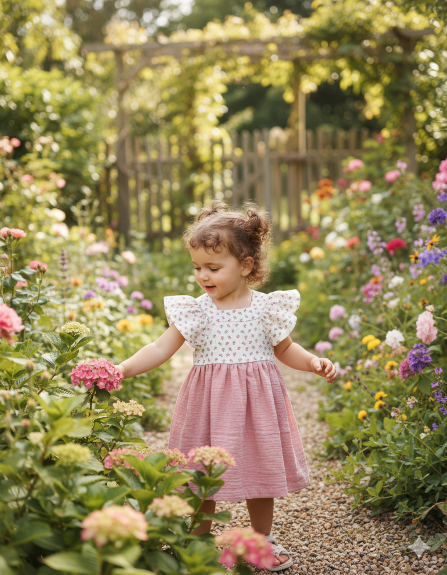 Vestido em musselina rosa com folhos em algodão com motivo floral.