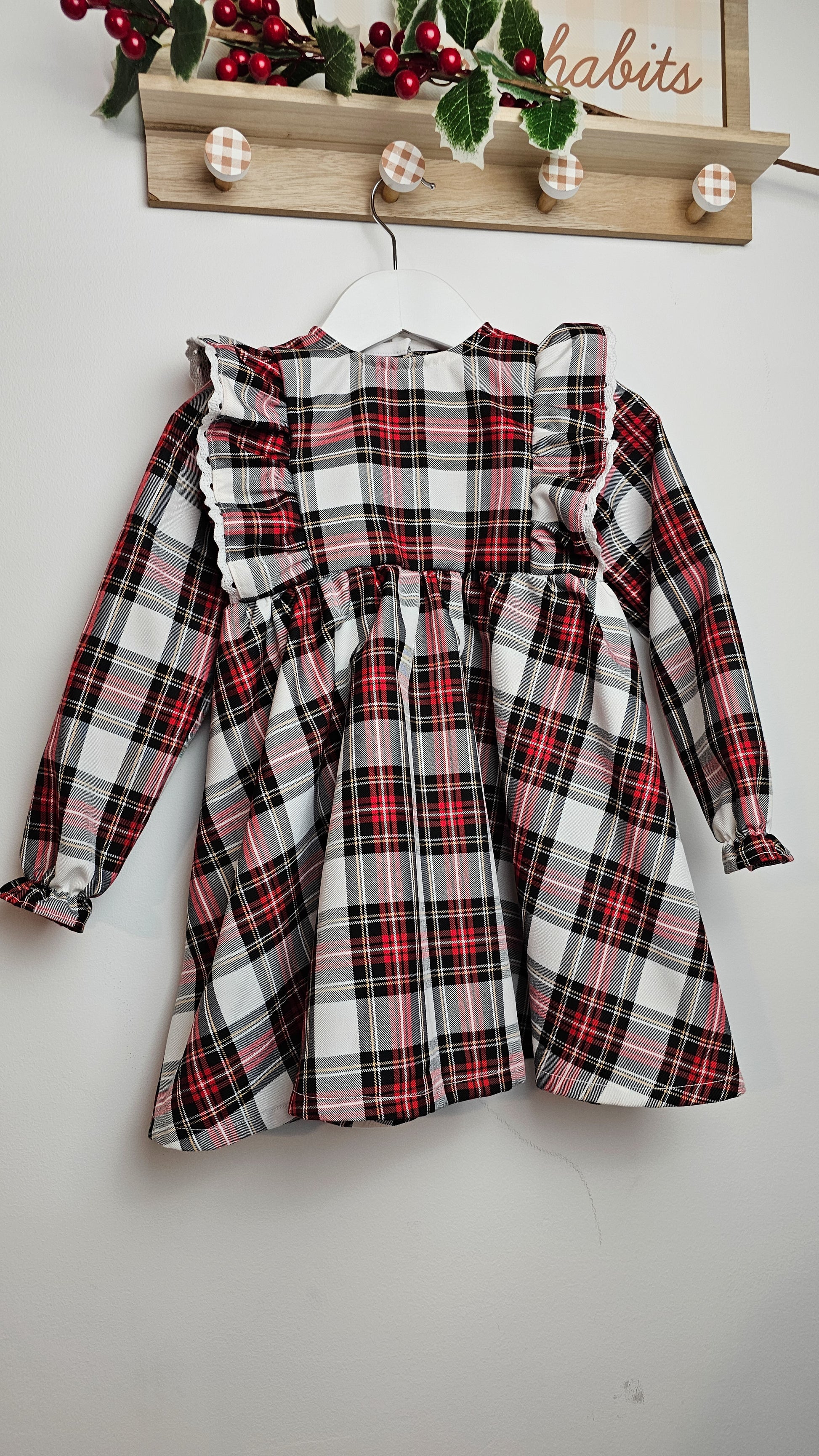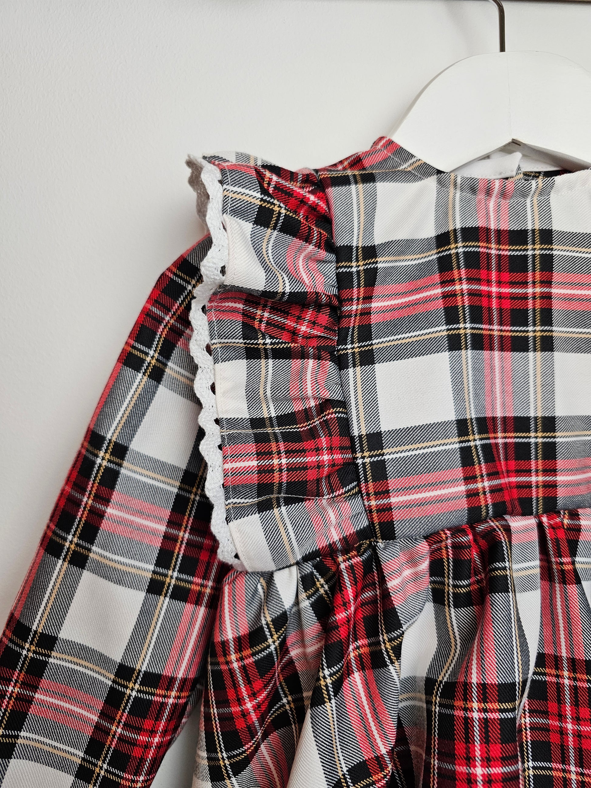 Vestido em vaiela em tartan xadrez vermelho, branco e preto com rendinha branca no folho.