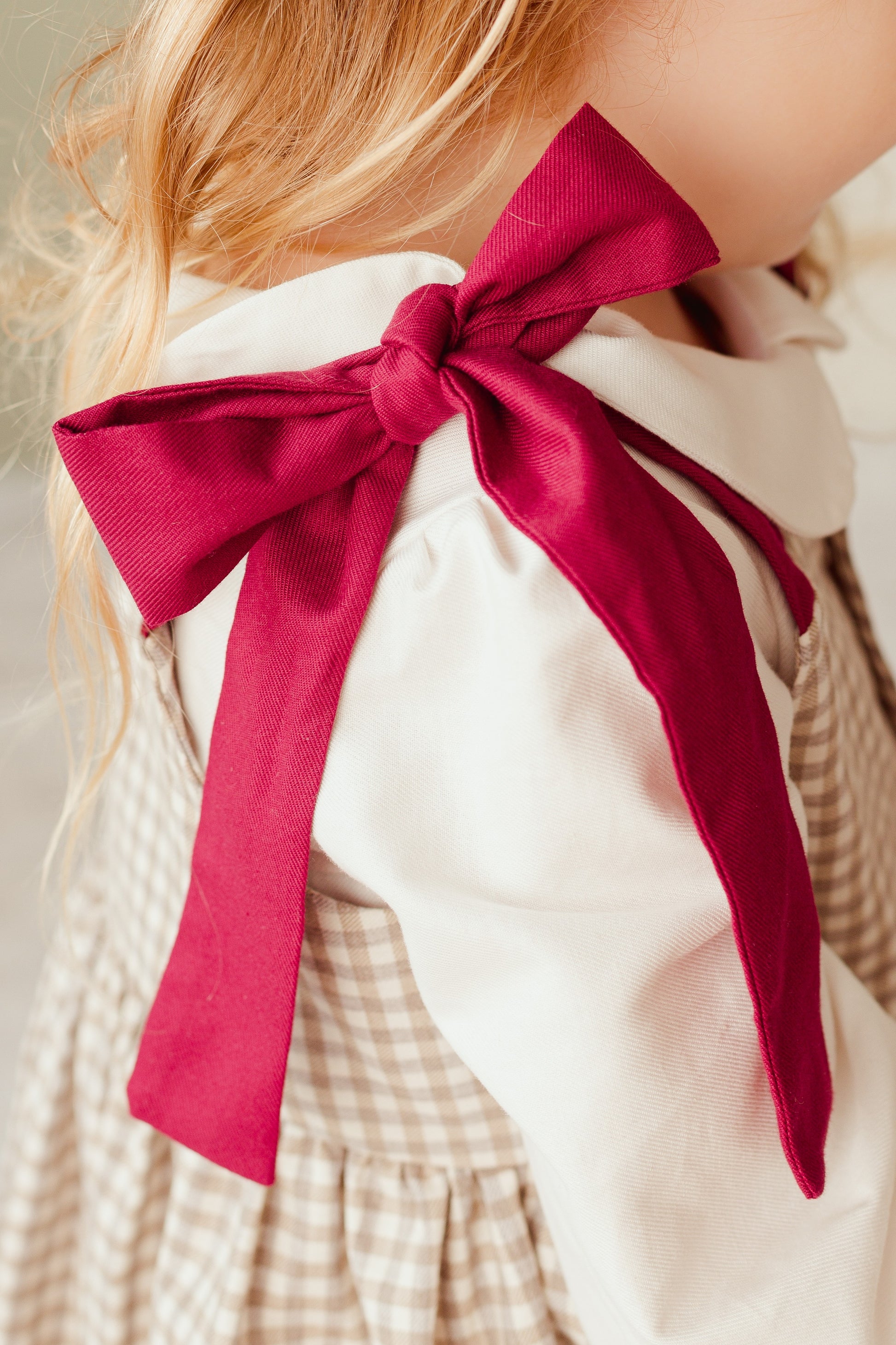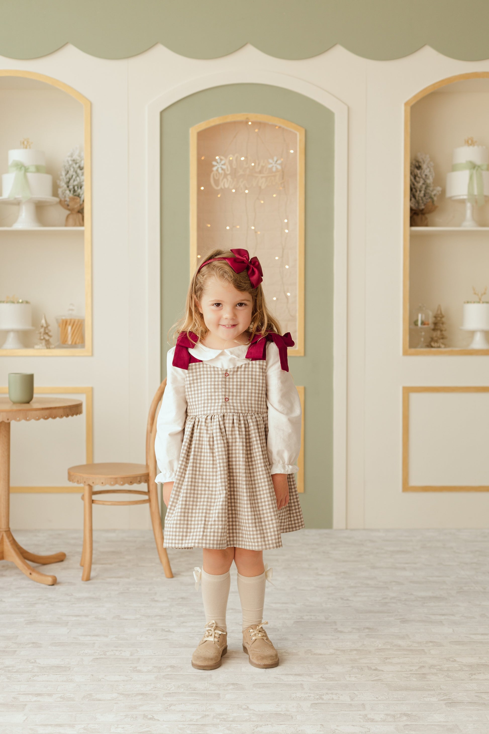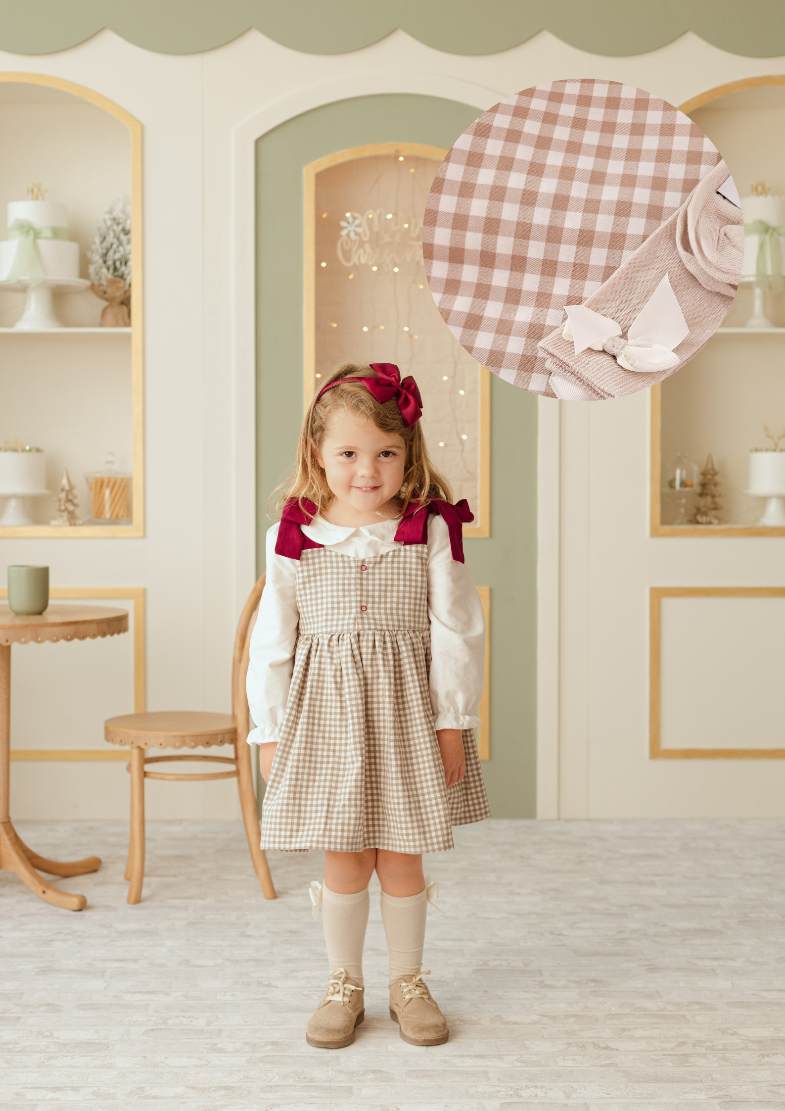 Vestido em vaiela xadrez beje e creme com alças ajustáveis em bordeaux. (*blusa não incluída, comprar secção tops/blusinhas)