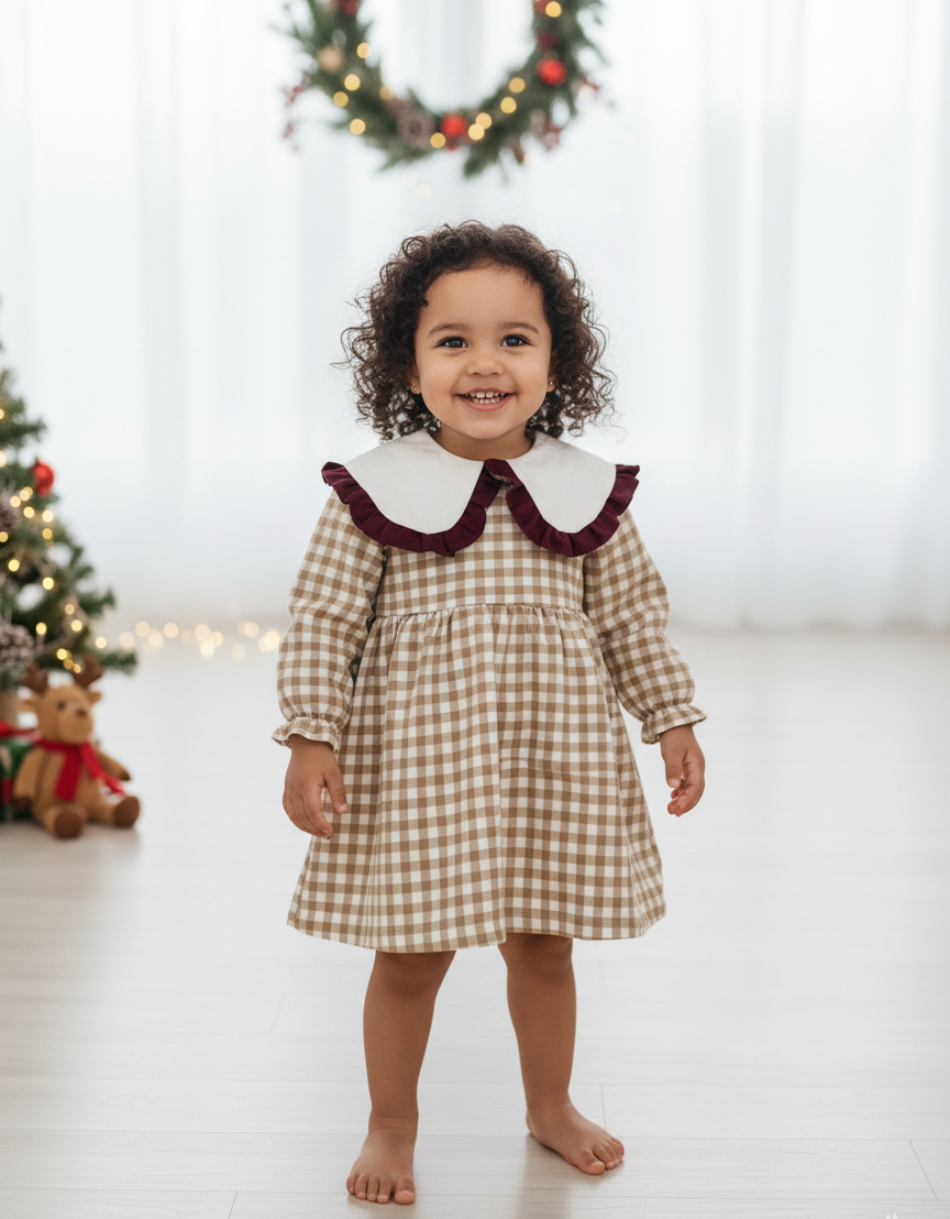 Vestido em vaiela creme com quadrados em tons beje com gola branca e folho da gola em bordeaux.